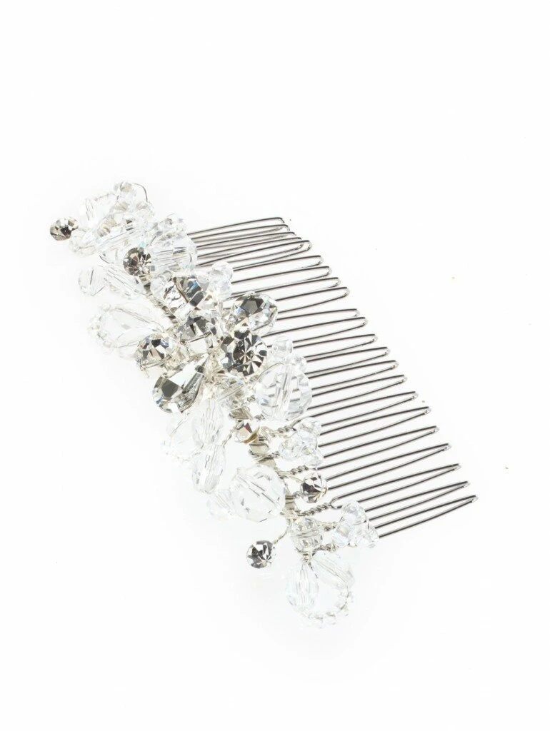 Deze zilverkleurige haarkam BB-1581 van Poirier is gemakkelijk in je haar te bevestigen. De kam is versierd met kristalletjes en strasssteentjes en wanneer hier licht op valt zal dit haaraccessoire prachtig gaan schitteren. Geef je bruidskapsel een extra sparkle met dit bijzondere item van Poirier.