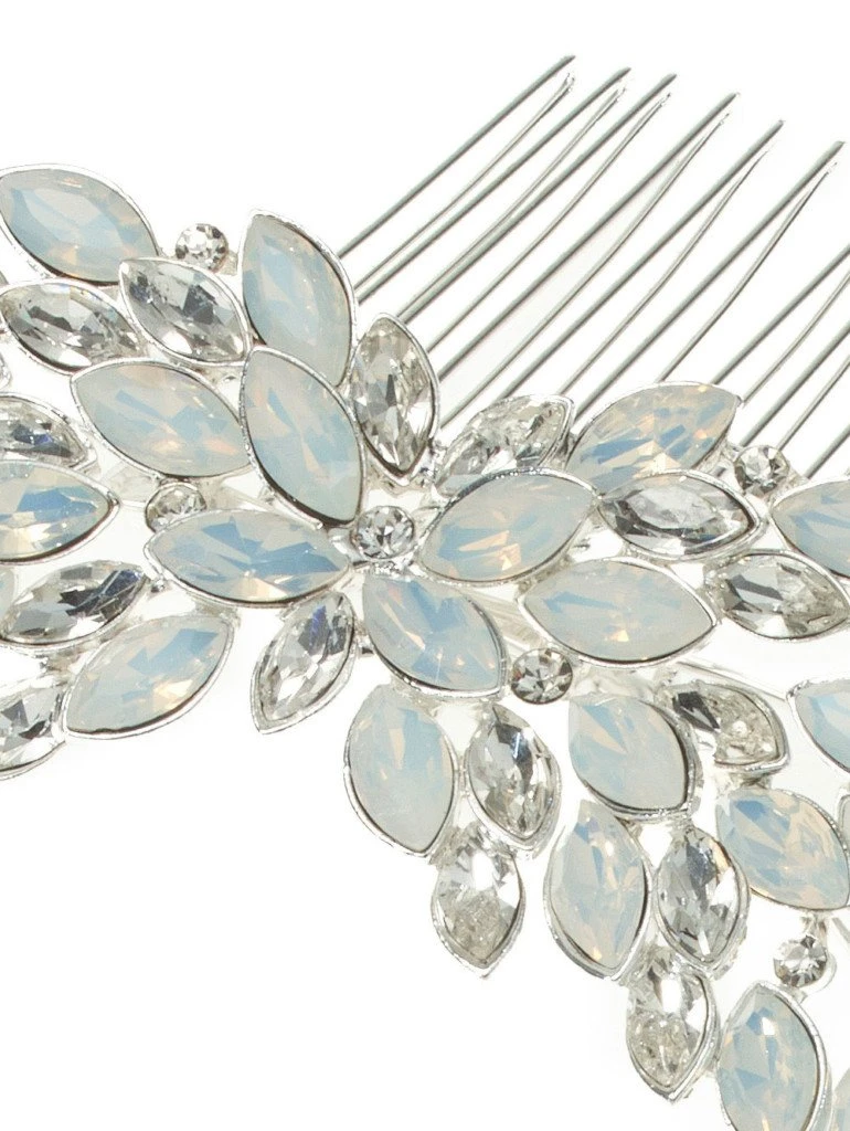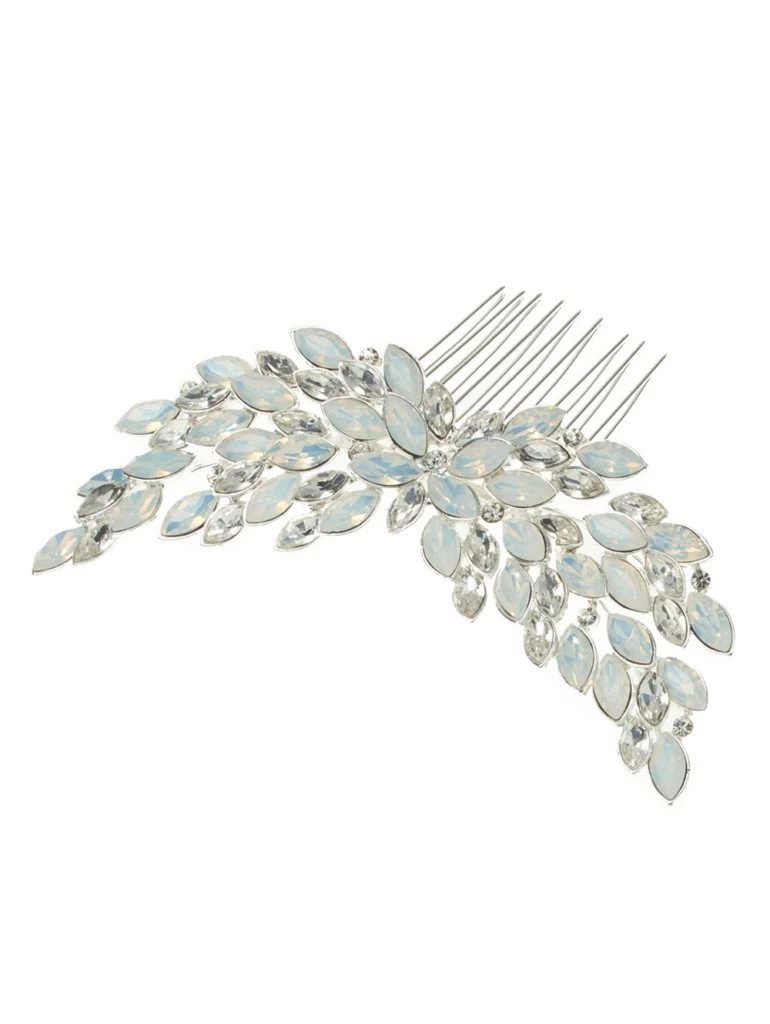 Zilverkleurig haarjuweel BB-465 op kam van het Nederlandse merk Poirier. Dit mooie haarsieraad heeft de vorm van een halve maan en is versierd met blaadjes van strass- en maansteentjes.