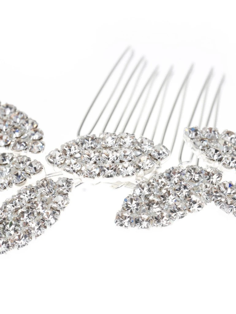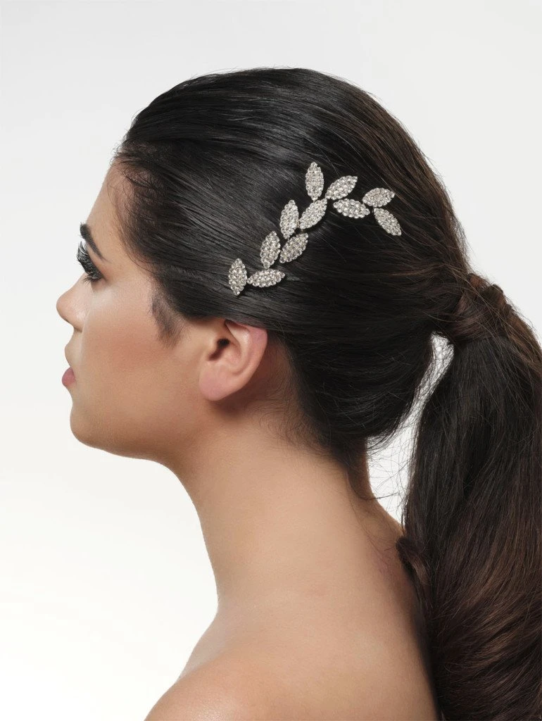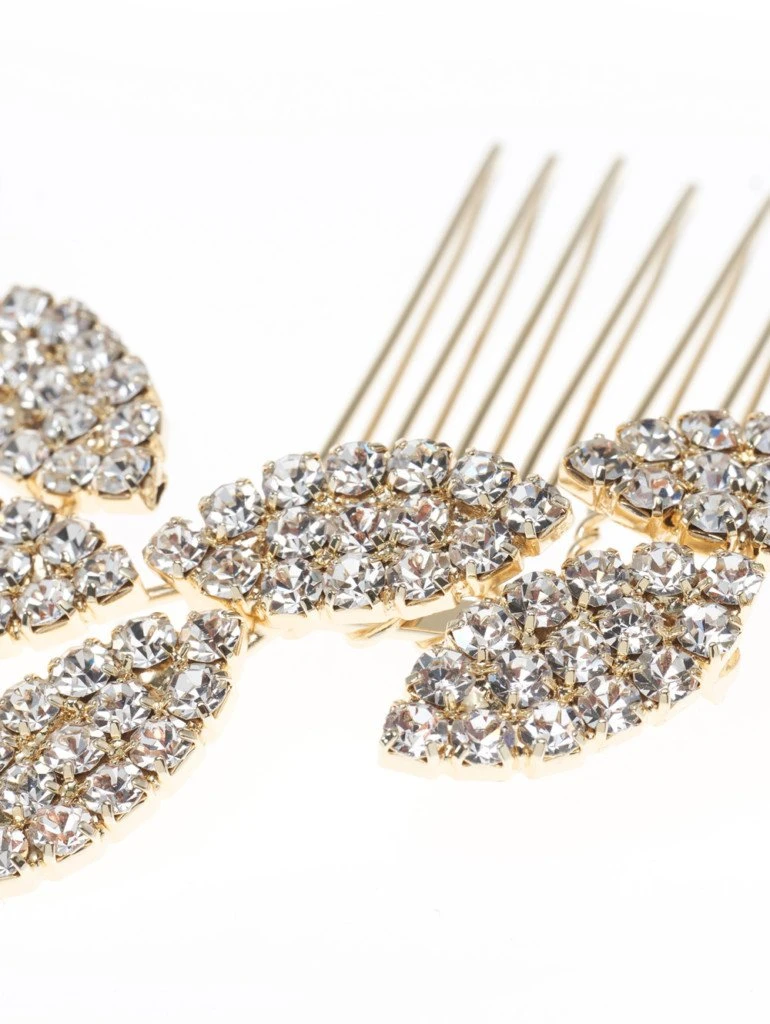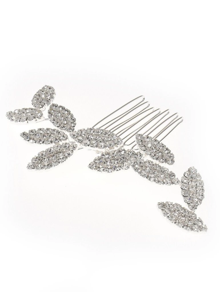 Goud- of zilverkleurig haarjuweel BB-466 op kam van het Nederlandse merk Poirier. Dit elegante haarsieraad heeft 11 bladvormpjes die zijn versierd met glanzende strass-steentjes en geeft een prachtig accent aan jouw bruidskapsel!
