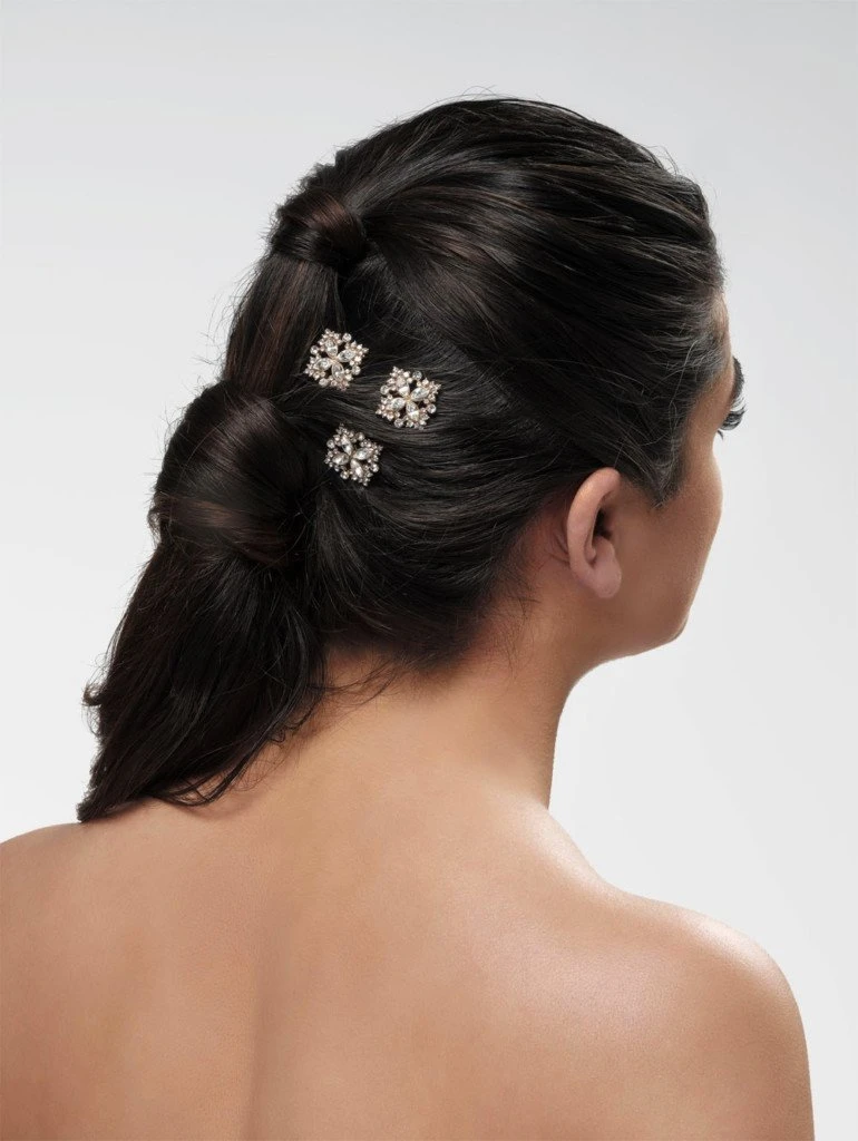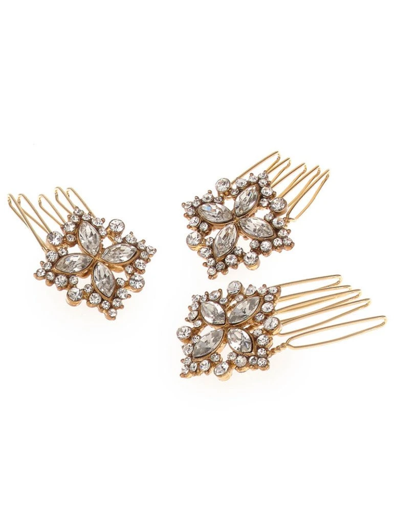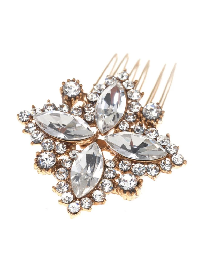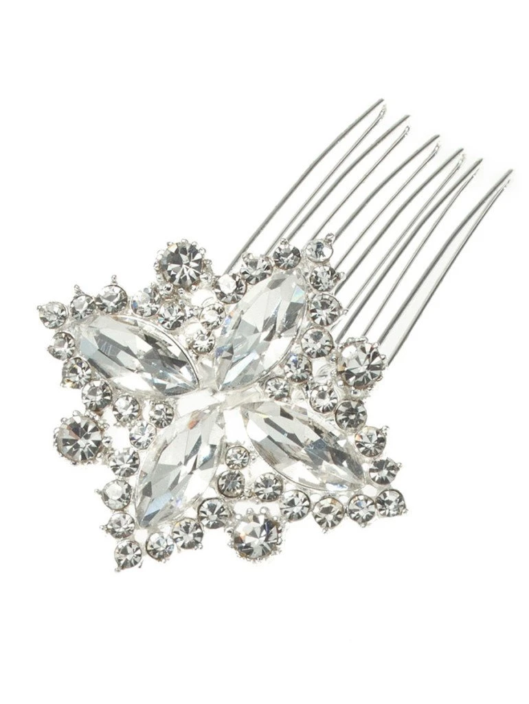 Haarkam BB-277 van het merk Poirier in de vorm van een sneeuwvlokje. Deze romantische kammetjes zijn versierd met strass-steentje en verkrijgbaar in antiek goud of zilver en worden geleverd in een setje van 3 stuks.
