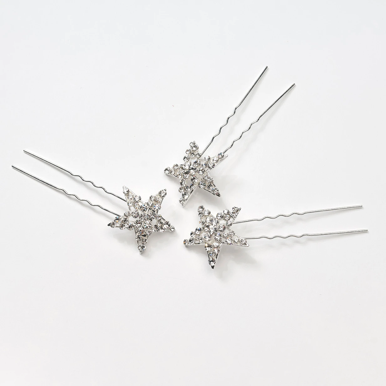 Haarspeld met ster van strass van het merk Poirier. De doorsnede is 3 cm, ze zijn verpakt per 3 stuks.