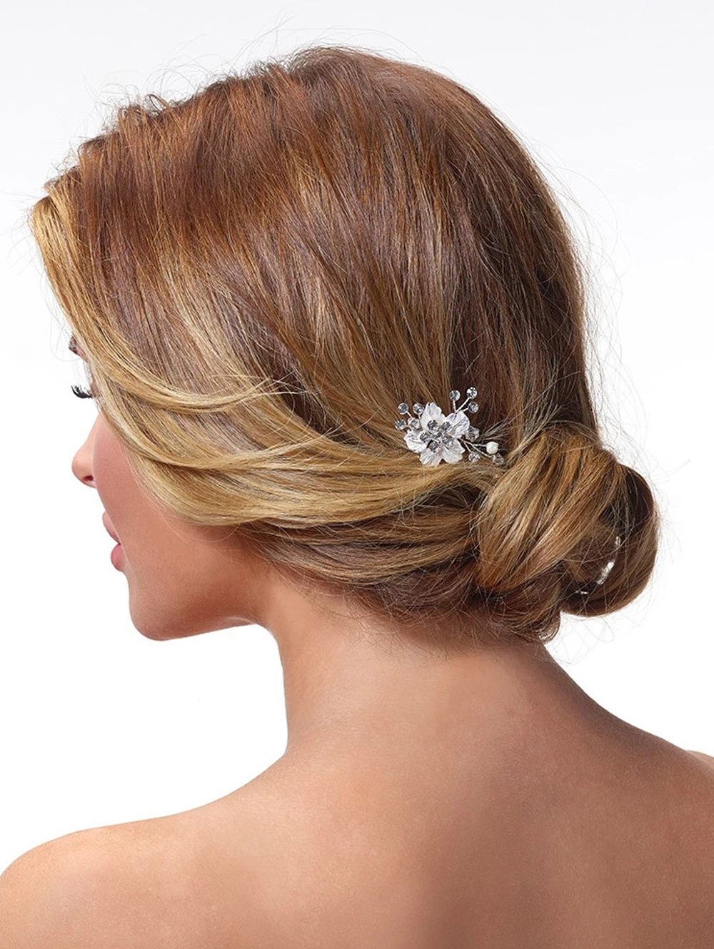 3 bloemetjes op kam van het merk Poirier. De bloemetjes zijn verkrijgbaar in zilverkleur of goudkleur en ze zijn bewerkt met pareltjes en strass.