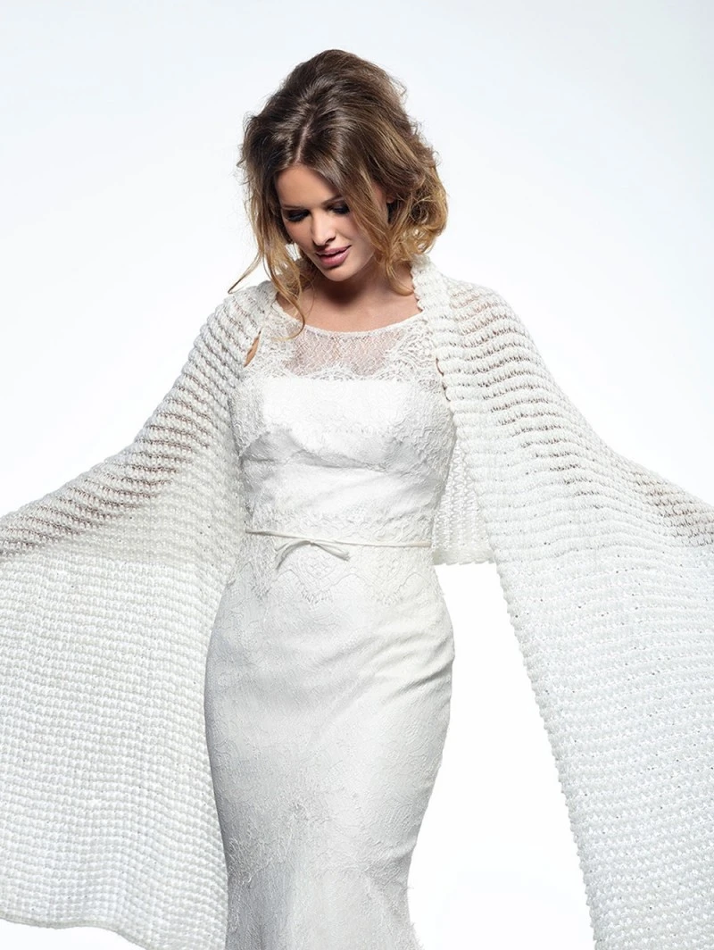 Gebreide stola van het merk Poirier in de kleur ivoor. De stola is versierd met zilverkleurige pailletten. De afmeting is 300cm x 85 cm.