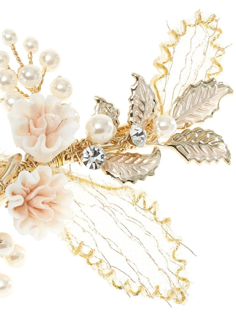 Ben je op zoek naar een prachtige goudkleurig haaraccessoire met strass van het merk Poirier? Dit haarsierraad is gemaakt met blaadjes van strass steentjes en pareltjes. Deze haaraccessoire kan ook worden gebruikt om boven de sluier te steken.