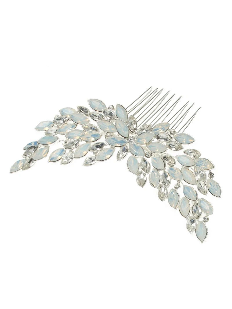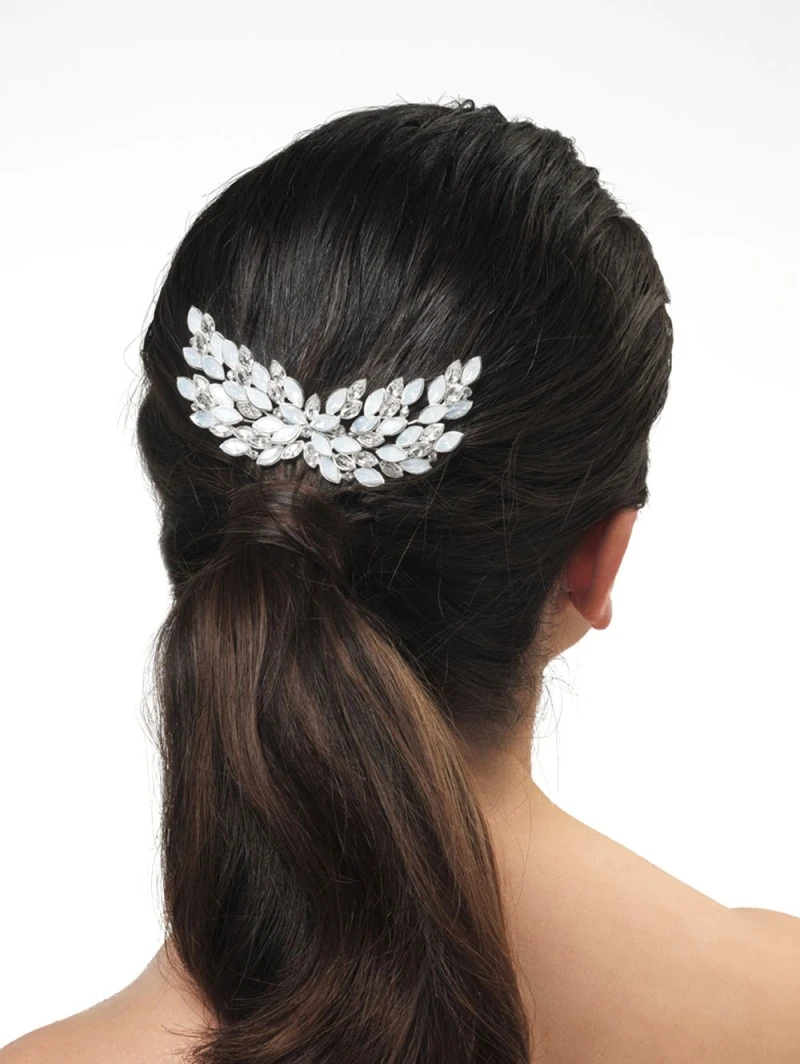 Ben je op zoek naar een prachtige zilverkleurige haaraccessoire met strass van het merk Poirier ? Dit haarsierraad is gemaakt met blaadjes van strass steentjes en maansteentjes. Deze haaraccessoire kan ook worden gebruikt om boven de sluier te steken.