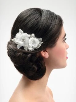 Ben je op zoek naar een prachtige Poirier haarcorsage? Â Deze haarcorsage is gemaakt op een kanten applicatie met organza bloemen, parels, transparante kraaltjes en stras steentjes op clip. Verkrijgbaar in ivoor en pink.