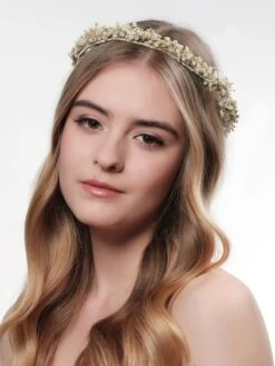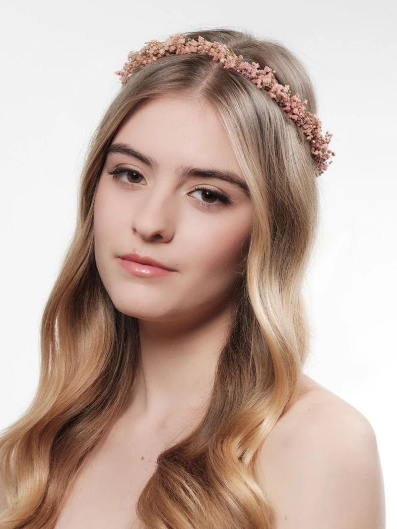Haarkrans BB 8595 met echte bloemetjes; gipskruid. Leuk voor een ibiza wedding, vintage stijl. De krans is leverbaar in rose en ivoor.