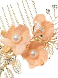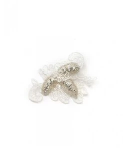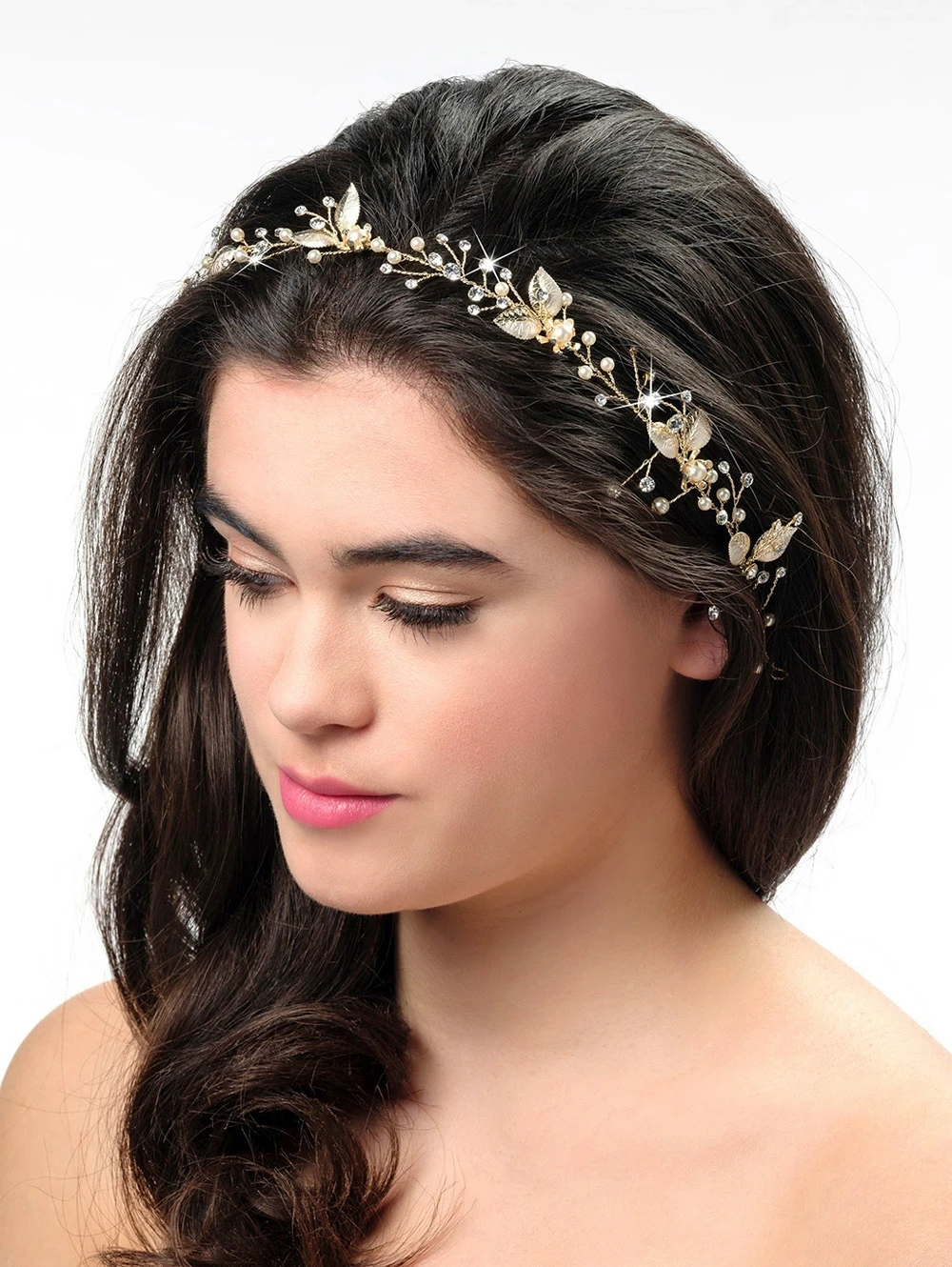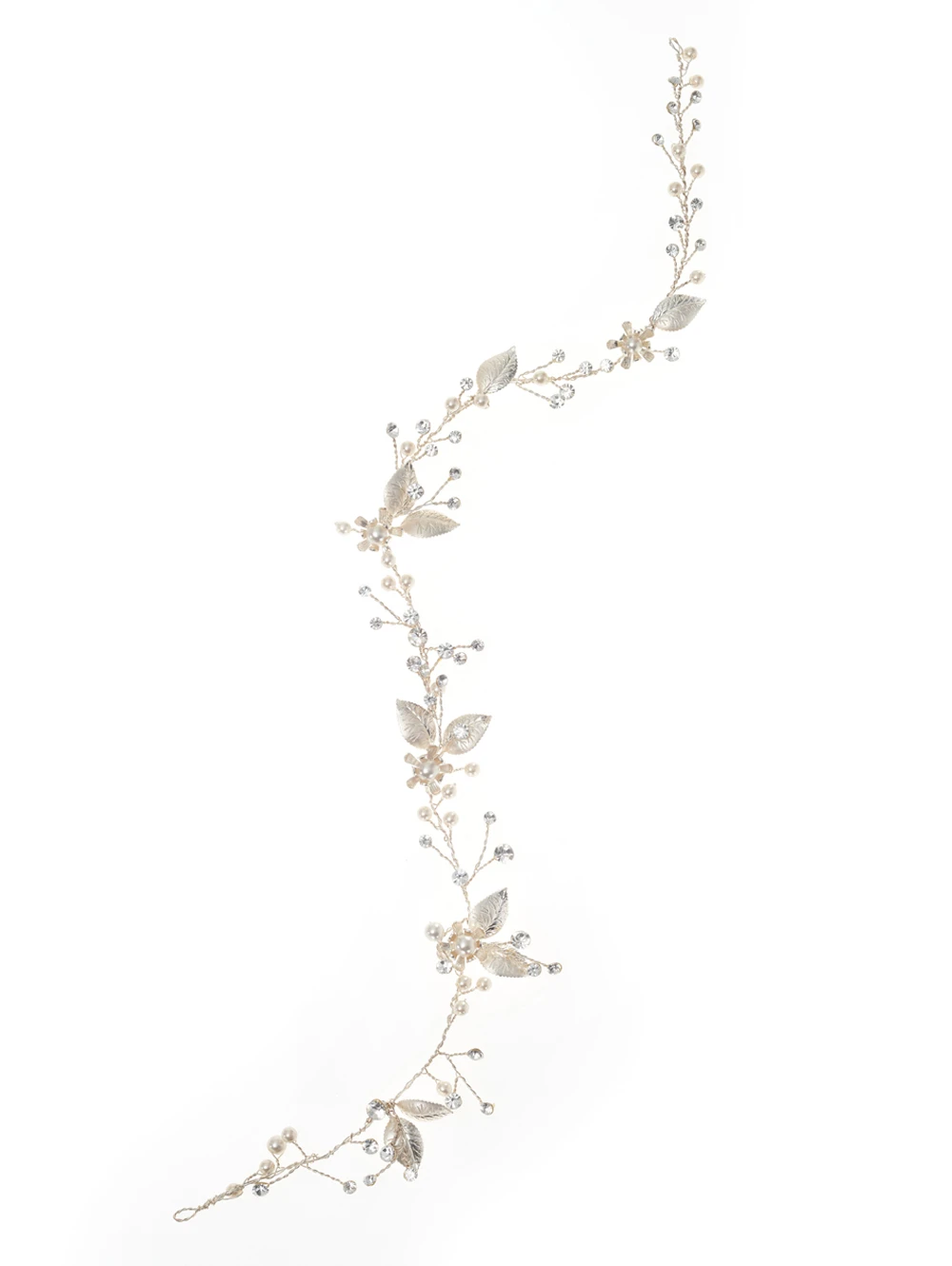 Deze hair accessoire is van het merk Poirier en is verkrijgbaar in zilverkleur, goudkleur en blushkleur. Het haarsieraad bestaat uit blaadjes versierd met pareltjes en strass op draad gemaakt.