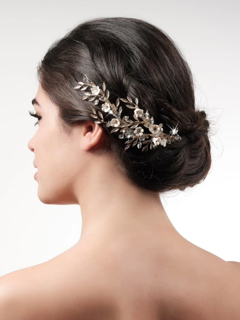 Ben je op zoek bent naar een glam haarsieraad met stras? Deze haaraccessoire uit de Romantic Collection van Poirier is prachtig. Dit haarsieraad op clip in de vorm van een takje heeft een goudkleurige basis met daarop ivoorkleurige bloemetjes, goudkleurige blaadjes en eveneens blaadjes bestaande uit stras steentjes. Je kunt dit haarsieraad combineren met een trouwkapsel van jouw keuze.