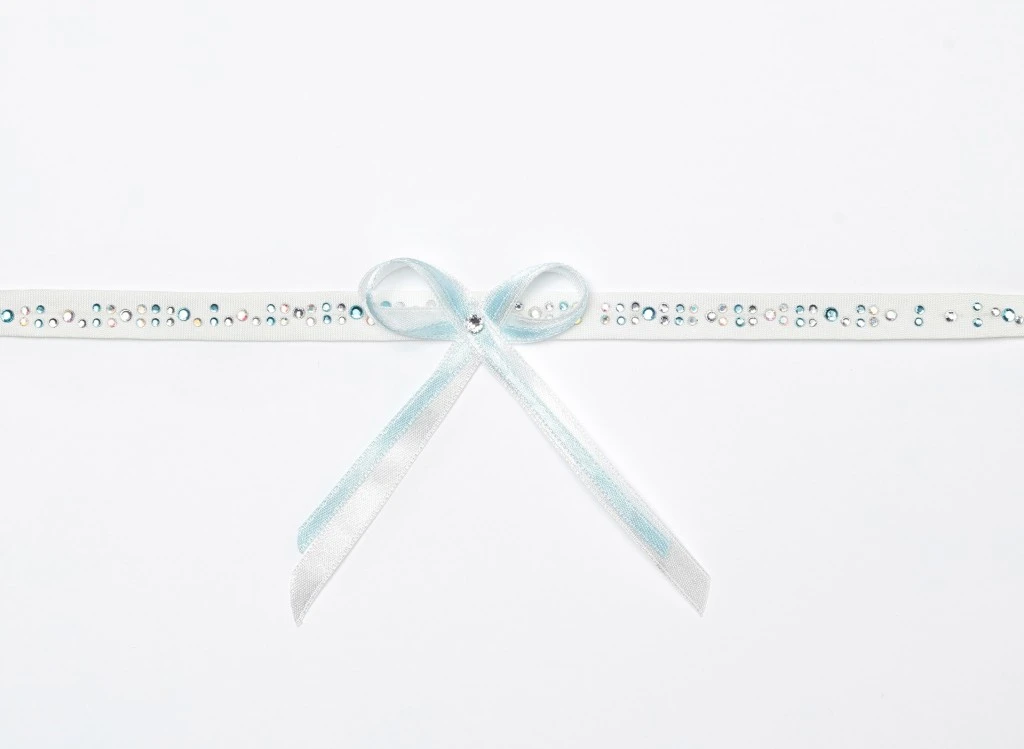 Kousenband van het merk Poirier in Ivory. De band is bewerkt met blauwe en zilveren strass-steentjes.