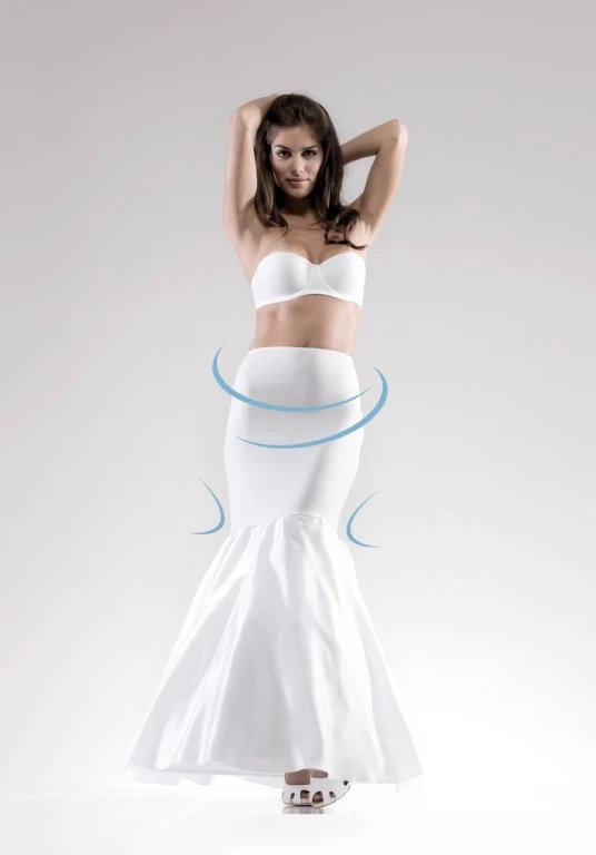 Deze petticoat heeft een lang jersey heupstuk, waardoor deze petticoat uiterst geschikt is voor het gebruik van sluik vallende bruidsjurken en een zeer goede pasvorm krijgt. Verder wordt deze geleverd met één laag tule en één balein. Over de rok gaat een satijnen overrok, waardoor de balein en tule strook niet doorschijnen.