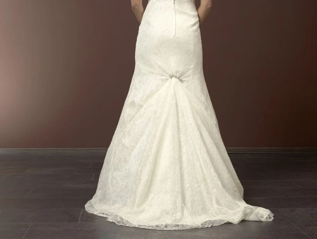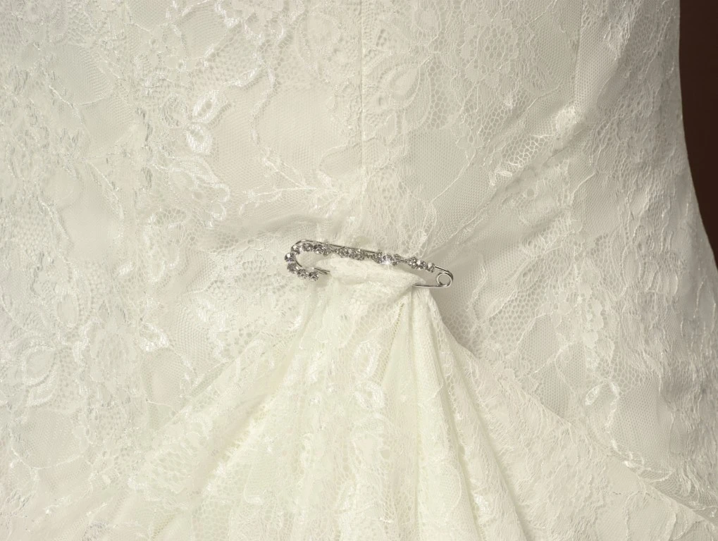 Zilverkleurige speld van het merk Poirier met strass steentjes om de sleep mee omhoog te halen.