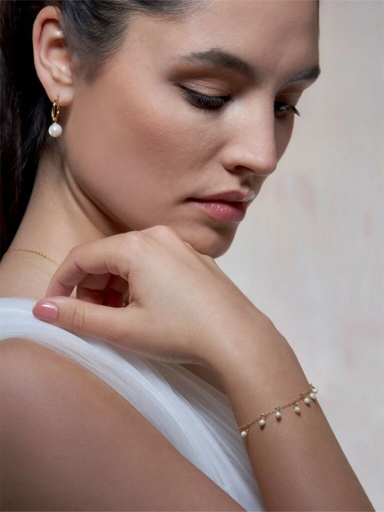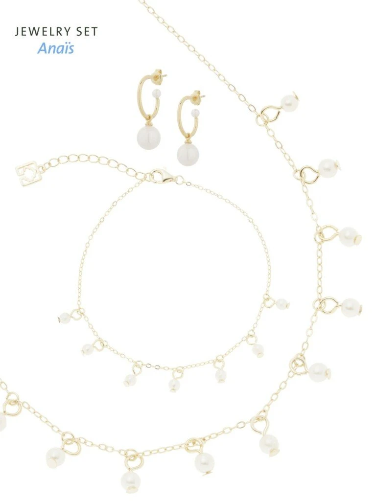 Sieradenset JS-004 Anaïs van het Nederlandse merk Poirier bestaande uit een ketting, armband en bijpassende oorbellen. Een armband en een ketting met kleine schakeltjes met als versiering kleine, glanzende pareltjes. De bijbehorende oorbellen vullen deze prachtige set perfect aan. Verkrijgbaar in goud en zilver.