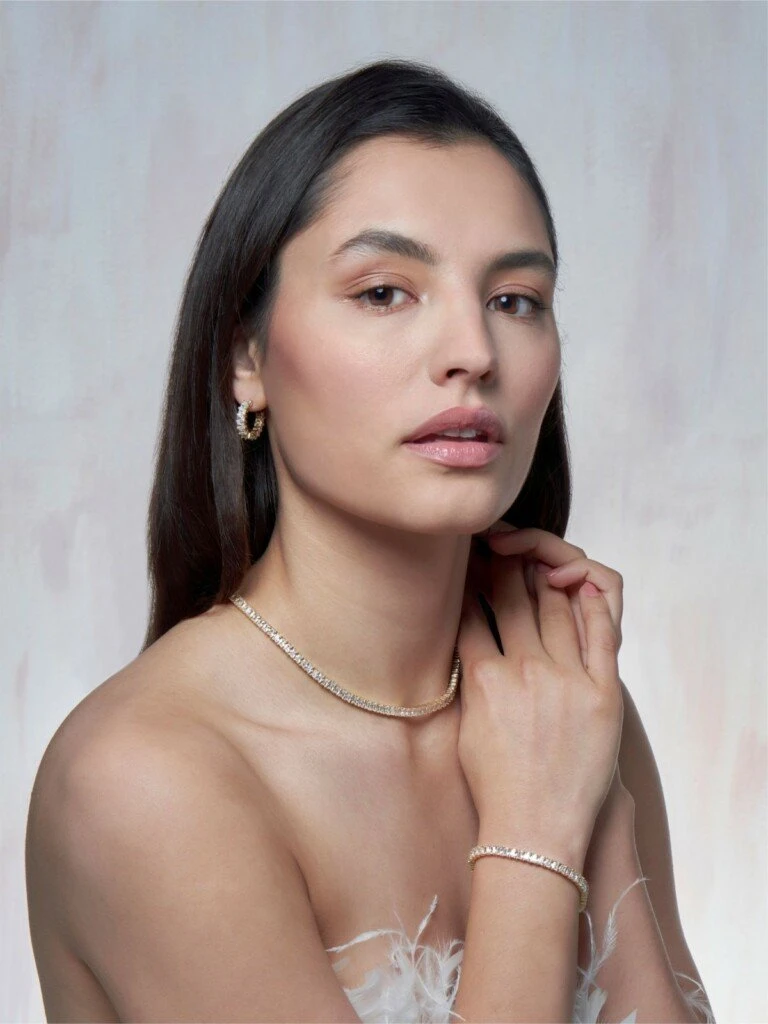 Een reeks van fonkelende met elkaar verbonden zirkoniasteentjes 4 gouden prong-settings. Deze juwelenset staat voor verbondenheid en samen stralen. De halsketting en armband van deze set zijn voorzien een hangertje met het Poirier monogram. Geef je wedding-look een touch of finesse en elegantie met deze bijzondere juwelenset van Poirier.