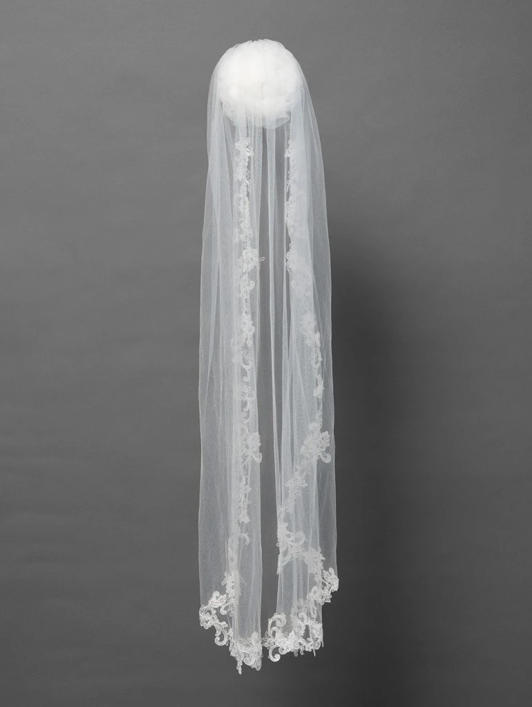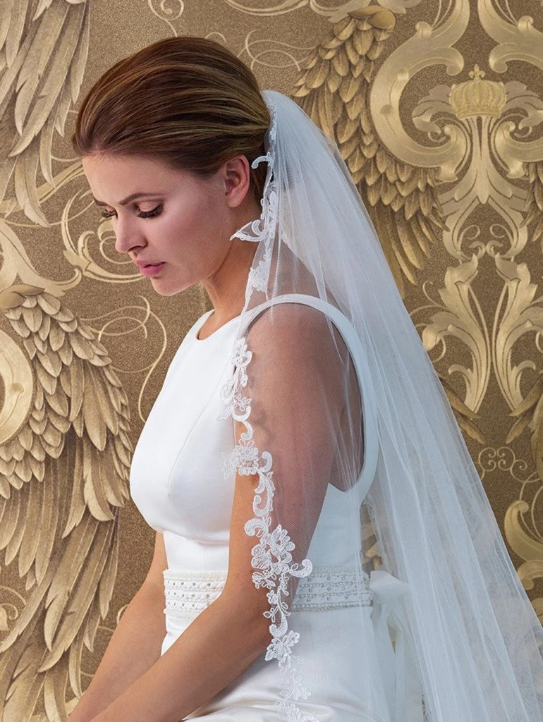 Korte sluier S140-120/1 van Poirier gemaakt van ivoorkleurige, zachte tule met een rand van kant versierd met pailletten. Deze elegante, enkellaags sluier heeft een totale lengte van 120 cm.