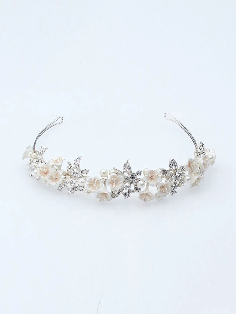 Luxe tiara BB-636 van het Nederlandse merk Poirier. Deze diadeem is versierd met strass-steentjes en ivoorkleurige porseleinen bloemetjes. Verkrijgbaar in goud (met blushkleurige parels) of zilver (met ivoorkleurige parels) geeft deze tiara een romantisch accent aan jouw bruidskapsel.